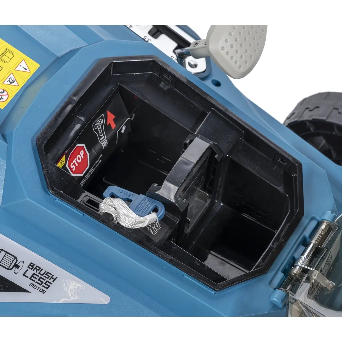 Akumulatory są bezpiecznie schowane w specjalnie zaprojektowanym miejscu w kosiarce, chroniąc je przed uszkodzeniami i warunkami zewnętrznymi podczas pracy.